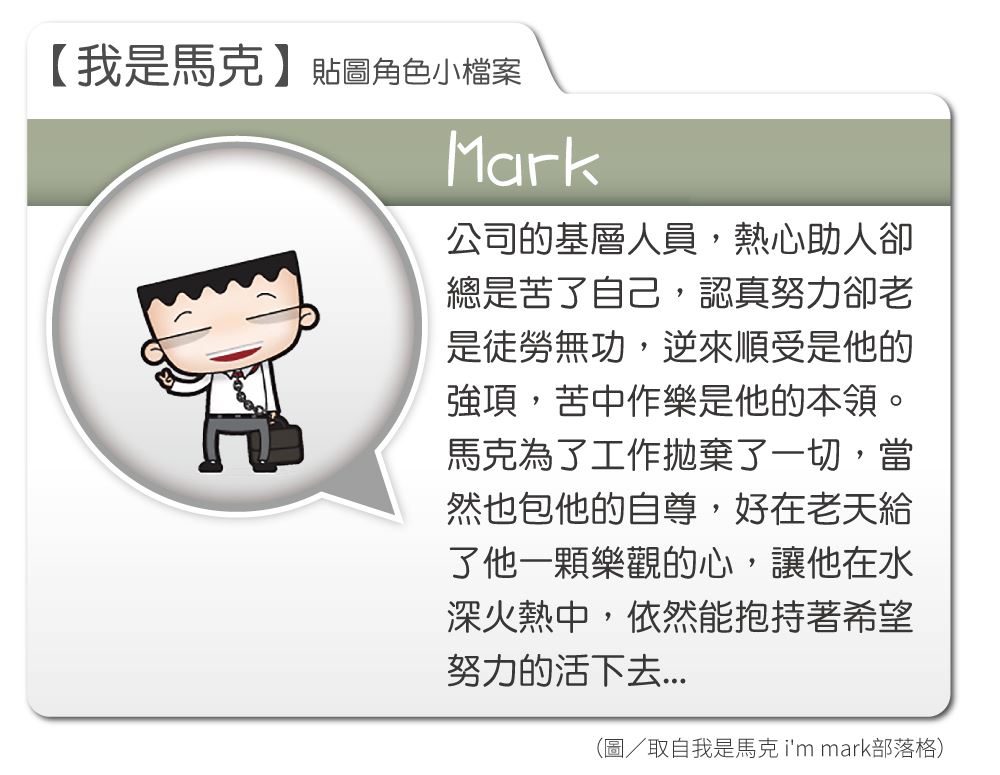 馬克今年滿10歲了,堪稱是台灣圖文創作角色的長壽人瑞,至今持續陪伴所有上班族靠腰、發牢騷,雖然角色設定仍是領人薪水的職場白領,但現實世界裡,一手催生出馬克的李含仁,早告別獨立創作的單兵作戰模式,目前身邊已有10人員工,有設計、文案、行銷,甚至還有動畫師。