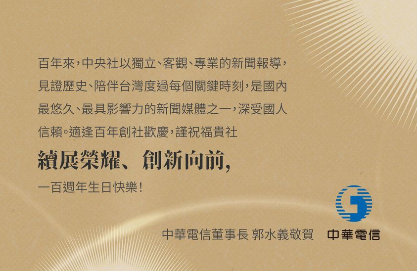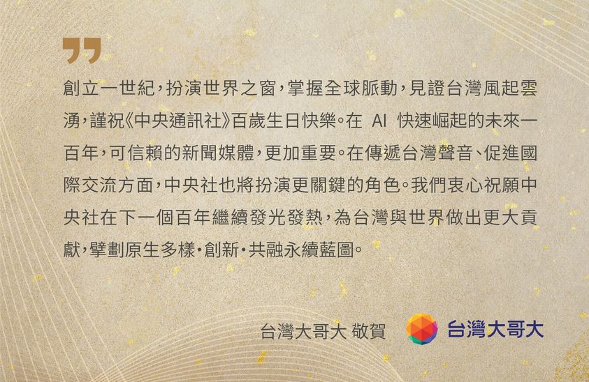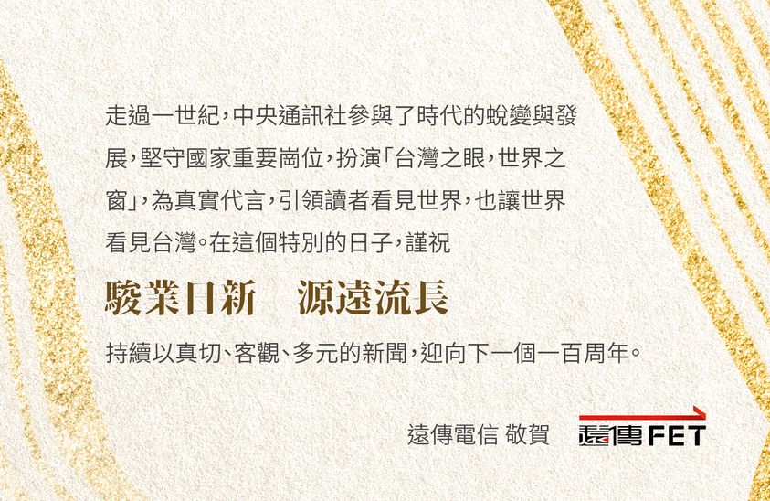 他指出,在假消息泛濫和政治分歧的時代,通訊社更應該努力做好提供真實新聞的工作。再次祝賀中央社,在新的百年開始的此刻,獻上最好的祝福,祝前程似錦。(編輯:林克倫、謝佳珍)1130701