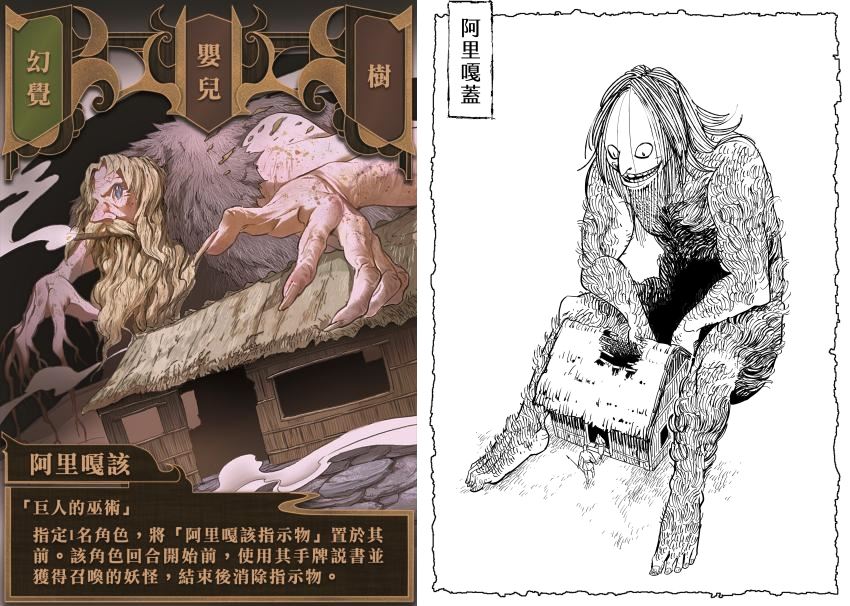 「阿里嘎蓋」為阿美族傳說中居住在花蓮美崙山區的巨妖,他們能施法術、喜歡嬰兒內臟,甚至與阿美族舉辦豐年祭的由來有關。在北地異開發的桌遊《說妖》及張季雅所繪《妖怪台灣》中均有著墨。(主辦單位提供)