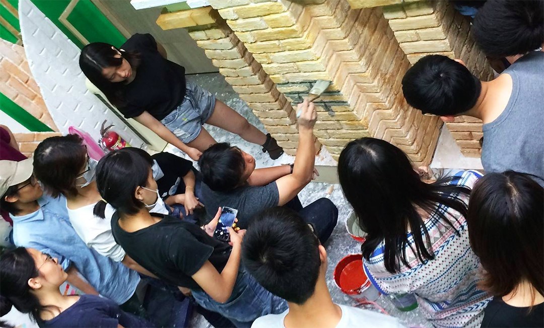 他們花不到3、4天,從無到有蓋出一座完整的古早三合院,「為確保小戴人身安全,每塊磚都是從保麗龍割出來形狀,黏在木板後再上色,屋瓦也是保麗龍」。這幾乎是不可能的任務,但他做到了。