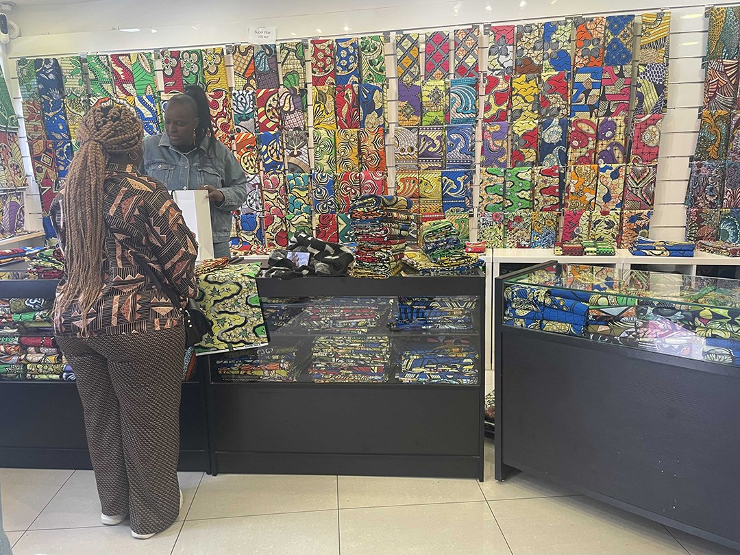 走進這個街區,豐富鮮豔色彩立刻映入眼簾 。穿著亮色系非洲臘染花布洋裝的黑人女性,婀娜多姿地在各色蔬果籃子之間選購;金飾店櫥窗裡盡是粗大的金項鏈、金戒指,美妝店則展示一排排不同花色假髮,髮廊、花布店一家接著一家。有人願花上7小時綁出成串的非洲辮子頭,也有人想用假髮蓋住細絲纏捲的黑人特殊髮質。