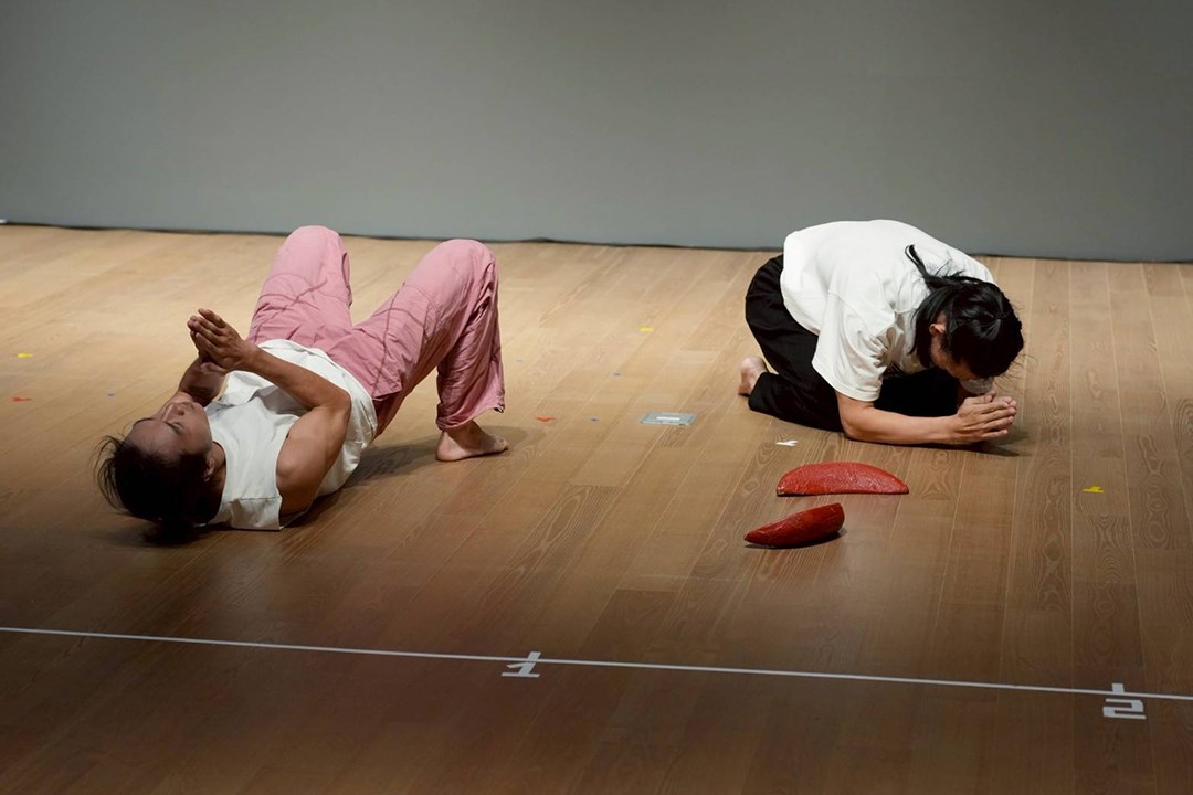 啟程前往日本大阪前,演出團隊在台灣文學糧倉進行唯一一次全員到齊彩排,他們用膠帶在地板上黏出180公分×180公分的方格,比擬實際舞台大小,在杜思慧說明下流暢出入,人人熱力四射,彷彿來自世界的觀眾已經在眼前。