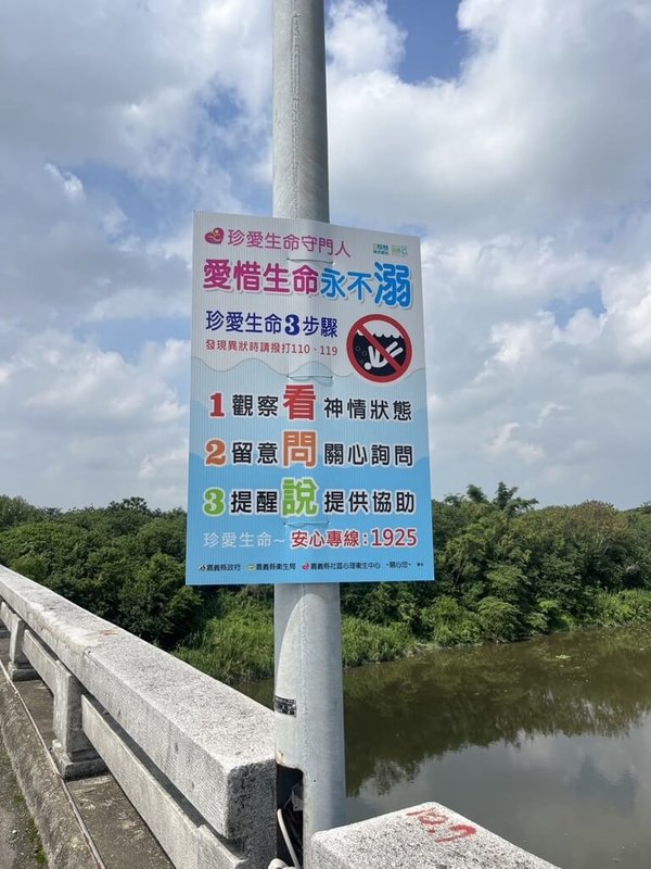 衛生局長趙紋華告訴中央社記者,衛生局近日已在布袋港及東石海堤、仁義潭、朴子溪、牛稠溪及八掌溪等逾20處高風險區域設置「珍愛生命永不溺」告示牌,提醒民眾行經橋墩或水域時,發現神情異常的人要發揮「守門人」精神,運用「一問、二應、三轉介」來協助,也可即時撥打電話110、119。