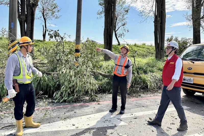山陀兒強陣風吹倒多處路樹、電桿,造成高雄多區停電,目前仁武區、大寮區、林園區等都有3000戶至6000餘戶不等戶數停電。陳其邁今天視察多處災損復原狀況,一早到和發工業區(河堤路二段)視察電線桿修復工程,也到自由、裕誠路口視察路樹清理情況。