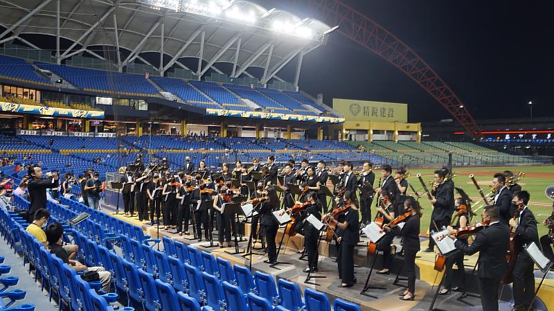 NTSO臺灣青年交響樂團,由指揮葉政德帶領,於中華職棒疫後首場賽前演奏由旅美作曲家編寫的「音樂百年」等作品