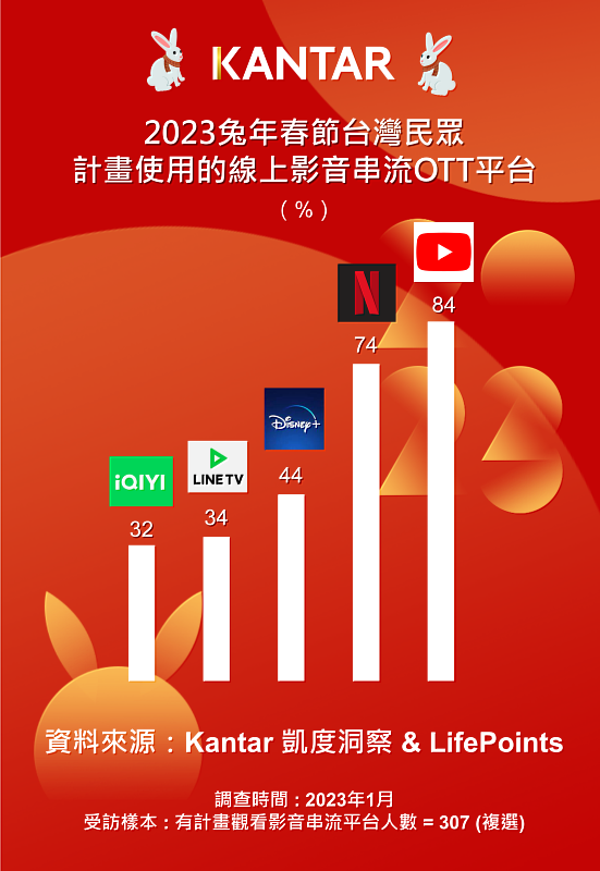 #OTT #線上串流影音平台 #YouTube #Netflix #Disney+ #農曆過年 #兔年 #新春調查 #春節假期 #Z世代 #Y世代 #嬰兒潮世代 #凱度洞察 #LifePoints #Kantar