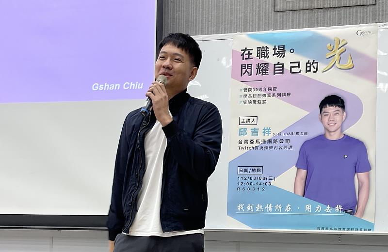 元智大學管理學院於3月8日邀請到邱吉祥校友為學弟妹們分享。目前任職於台灣亞馬遜網路公司Twitch實況娛樂內容經理,主要負責公司財務及策略分析、對外公關發言、主持、電競賽評等,透過他的分享,讓大家有機會認識直播媒體科技產業。