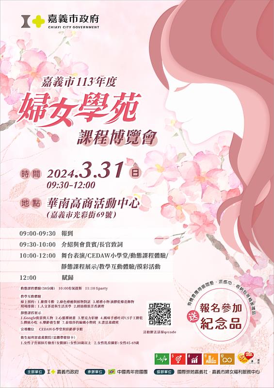 (中央社訊息服務20240326 10:34:54)嘉義市113年度婦女學苑課程博覽會訂於3月31日(星期日)上午9時30分至12時,假華南高商活動中心(東區光彩街69號)舉辦「嘉義市113年度婦女學苑課程博覽會」活動當天有靜態課程展示、體驗課程、動態展演、婦癌篩檢與宣導活動。也結合國際崇她嘉義社辦理CEDAW小學堂宣導闖關活動,完成闖關活動即可參加好康摸彩,有機會獲得瑜珈墊、涼感巾、收納包等精美禮品;精彩又好玩的課程博覽會邀請您一同來參與呦!