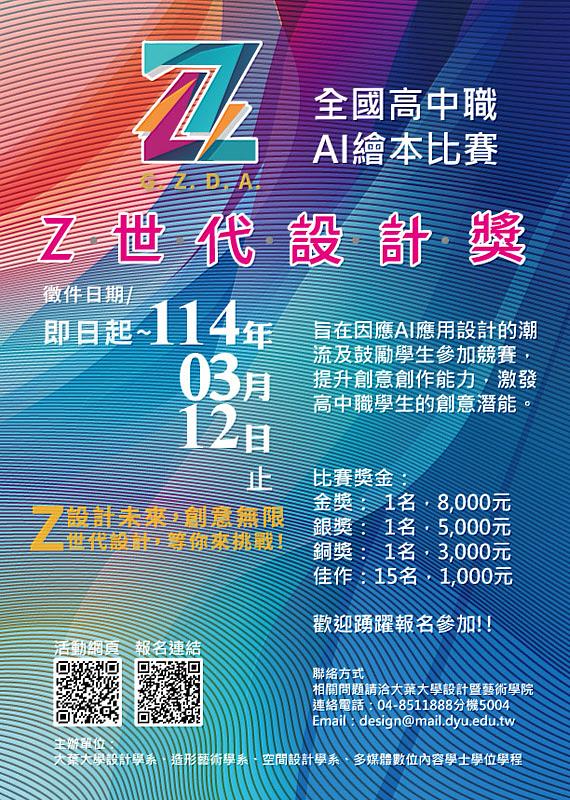 (中央社訊息服務20250214 09:36:35)因應當前AI應用設計潮流,為了激發高中職學生的創意潛能,大葉大學〈Da-Yeh University〉設計暨藝術學院推出「2025全國高中職Z世代設計獎AI繪本比賽」,即日起至3月12日徵件截止,鼓勵青少年發揮創意與設計思維,提升數位創作能力。
