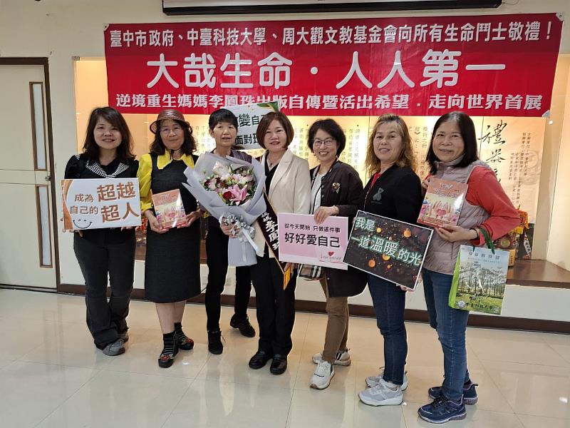 (中央社訊息服務20250324 14:21:16)在生命低谷中重生,「逆境重生媽媽李鳳珠」成為希望的燈塔,以堅韌不拔的精神,從人生困境中昂首前行,並將這段動人旅程化為繪本自傳《打造第三人生》。今日(114/3/24),周大觀文教基金會攜手中臺科技大學,在該校藝文中心隆重舉辦「大哉生命.人人第一—逆境重生媽媽李鳳珠出版自傳暨活出希望.走向世界首展」,透過生命故事傳遞勇氣與愛的力量。