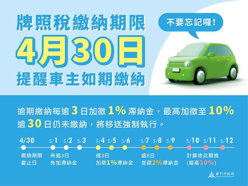 使用牌照稅繳納期限至4/30 竹市稅務局提醒車主依限儘速繳納