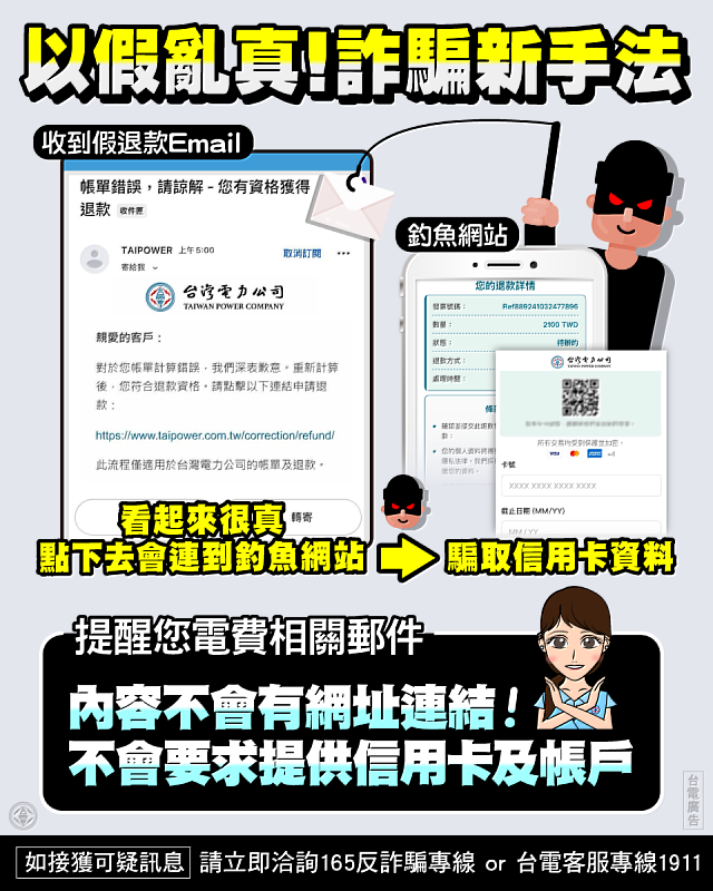 台電提醒,民眾若接獲任何可疑郵件、簡訊或電話,請立即撥打台電公司24小時客服專線1911或警政署165反詐騙專線詢問,全民攜手防詐,守護荷包安全!