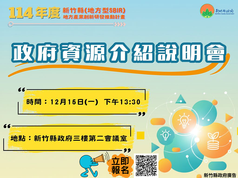 新竹縣政府為提升轄內企業創新研發能力,推動產業升級與高值化發展,除持續辦理「新竹縣地方產業創新研發推動計畫(地方型SBIR)」,積極協助在地中小企業強化技術創新與市場競爭力外,亦鼓勵企業善用中央各項研發補助計畫及輔導資源。縣府將於12月15日在新竹縣政府3樓第2會議室舉辦政府計畫資源介紹說明會,歡迎在地企業踴躍參與。