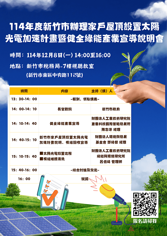 (中央社訊息服務20251203 10:30:51)為提升新竹市轄內小型私有建物再生能源發電設備設置量與能源推廣政策,新竹市政府將於12月8日14時在新竹市稅務局7樓視聽教室,辦理「114年度新竹市辦理家戶屋頂設置太陽光電加速計畫暨健全綠能產業宣導說明會」,當天除說明補助規則及申請程序外,也將分享健全綠能產業宣導,歡迎有興趣的單位及民眾踴躍報名參加(