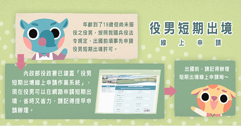 市府指出,每年元旦與春節連假前,常有役男因未提前申請出境核准,導致無法登機、行程受阻的情形。為便利役男申請,內政部役政司提供「役男短期出境線上申請系統」(https://reurl.cc/XaqrXa),役男在出國前3日至30日間上網提出申請,經查無管制即可立即核准。核准通知單自核准日起1個月內可多次使用,節省時間又方便。