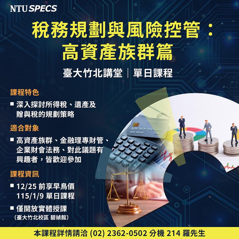 臺大竹北校區開設《稅務規劃與風險控管-高資產族群篇》課程 12/25前享優惠