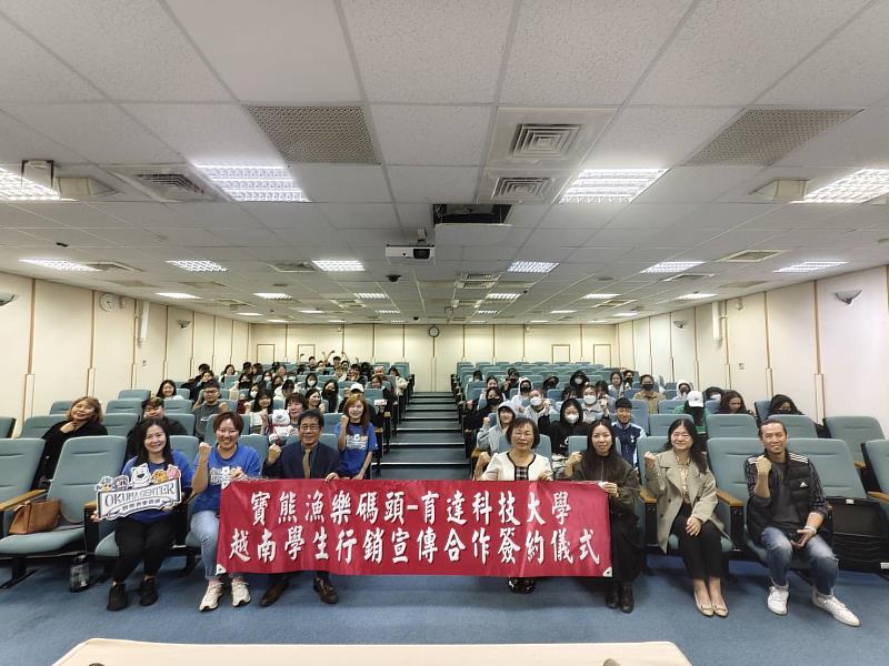 (中央社訊息服務20251220 16:36:29)為深化產學合作、培育國際觀光行銷人才,育達科技大學今日與「寶熊漁樂碼頭」舉行產學合作備忘錄(MOU)簽約儀式,正式啟動雙方合作關係。活動由育達科技大學觀光休閒管理系規劃,現場並有超過60位越南籍學生觀禮參與,展現學校推動新南向政策與國際化教學的具體成果。本次簽約儀式由育達科技大學校長吳菊、寶熊漁樂碼頭館長吳德利代表簽署合作備忘錄,象徵雙方將在觀光行銷、實務教學與跨文化推廣等面向展開長期合作。