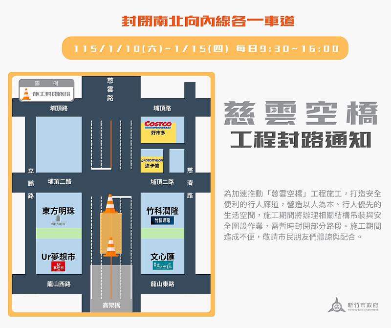 工務處指出,慈雲空橋位於關埔地區,橫跨慈雲路並連接埔頂三路,為竹市推動「人本交通」的重要節點工程,旨在提供安全、便利的步行通道,改善行人穿越車流的風險。明(115)年1月10日至1月15日,每日9時30分至16時佔用慈雲路南、北向內側各一車道,進行臨時施工架搭設;鋼構施工平台吊裝作業於1月19日至1月24日,每日22時至隔日6時,封閉北向全線車道;1月24日至1月30日,每日22時至隔日6時,封閉南向全線車道。