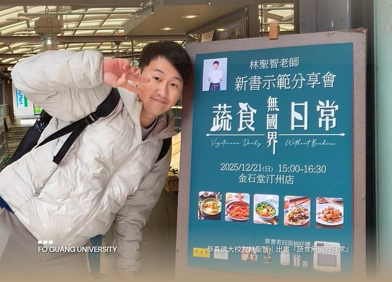 (中央社訊息服務20251222 18:30:05)佛光大學健康與創意蔬食產業學系傳來佳音,第一屆蔬食系學生,更是「佛大之光」的蔬食料理廚師林聖智,近日正式出版新書《蔬食日常無國界》,以多年累積的廚藝實力與國際經驗,帶領讀者走進中式、日韓、南洋、歐美等多元料理文化,展現蔬食料理的美味多變與高度可塑性,為純素飲食開啟全新的想像與可能。