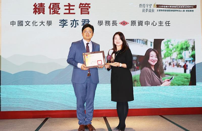 (中央社訊息服務20260106 10:36:04)中國文化大學原住民族學生資源中心長期深耕原住民教育,成果屢獲教育部高度肯定。繼112年榮獲教育部「績優原資中心學校」、113年「績優原資中心人員」,114年再度傳來捷報,由學務長兼原資中心主任李亦君教授獲頒教育部「績優原資中心主管」,寫下文大原資中心連續3年獲得教育部原民教育指標性獎項的亮眼紀錄,達成難能可貴的「3連霸」里程碑。