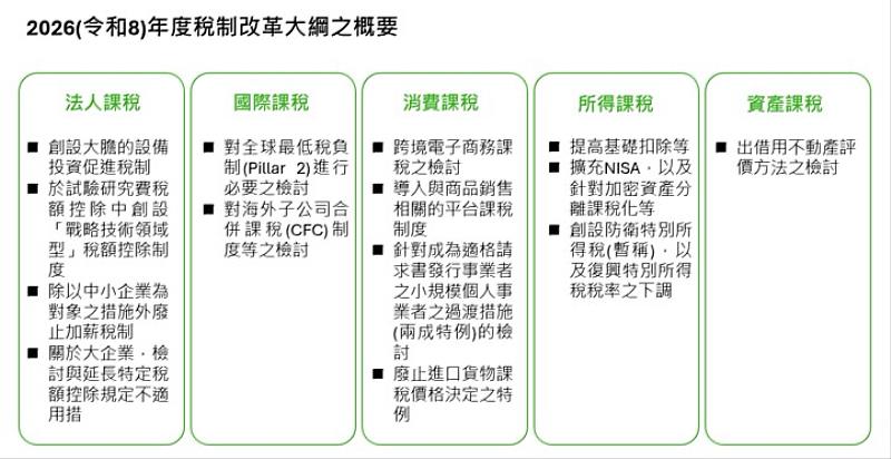 (中央社訊息服務20260205 16:04:28)因應國際局勢快速變遷,日本內閣於2025(令和7)年底公布《2026(令和8)年度稅制改革大綱》,在其大綱中,基於物價上升以及美國關稅政策對日本國內外產生影響的情況,以「經濟為本的財政」為方針,提出為了透過大膽的「危機管理投資」及「成長投資」實現強勁經濟成長的稅制改革方案。