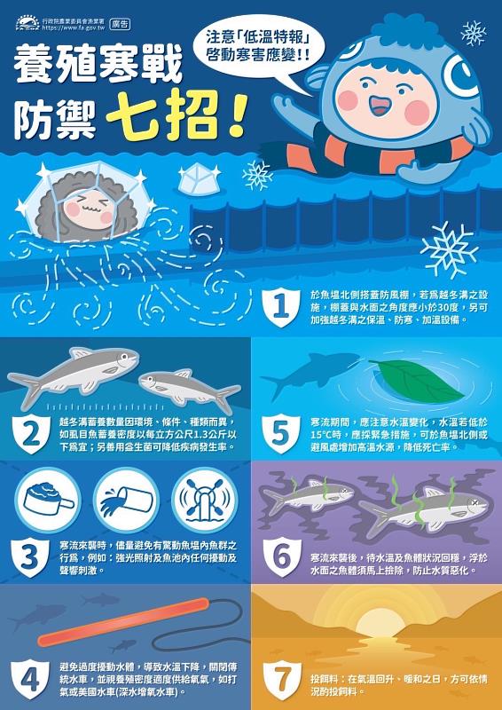 漁業署再次強調,面對極端氣候及冷氣團或寒流侵襲,無論是海上箱網或陸上魚塭之養殖業者宜確實加強越冬設備及管理措施,對於不適合冬季養殖之熱帶魚種,應避免於冬季養殖並作好平時之管理,以減少養殖損失。