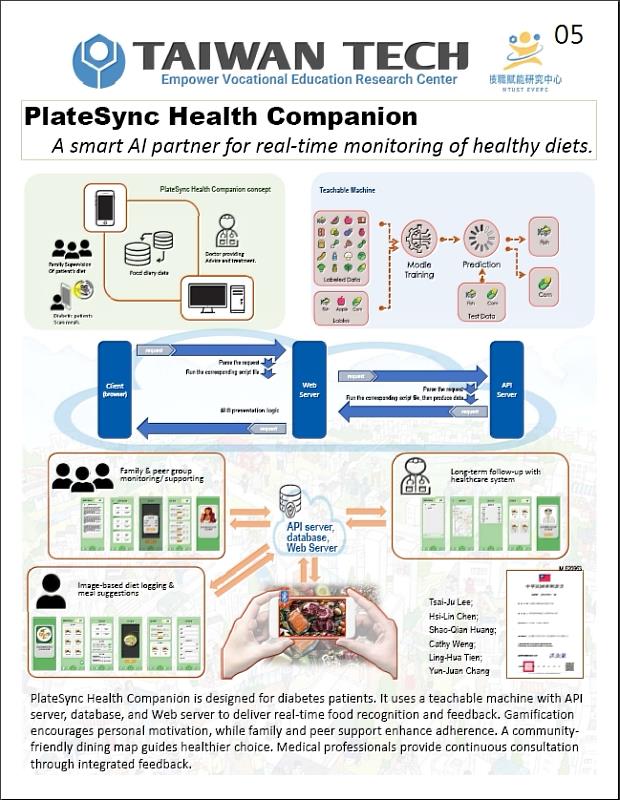 (中央社訊息服務20260326 09:55:45)在國際創新舞台上,臺灣科技大學的跨領域合作團隊再次發光發熱。於2025年舉行的第19屆波蘭國際發明展暨發明競賽中,由臺科大數位所暨技職賦能研究中心(NTUST Empower Vocational Education Research Center)師生李采儒、翁楊絲茜、田玲華、張筠娟,聯手新北高工資訊科主任陳錫齡及學生黃紹謙共同研發的創新作品「PlateSync 健康夥伴:智慧AI夥伴,健康飲食監測零時差」(PlateSync Health Companion: A smart AI partner for real-time monitoring of healthy diets),在來自26個國家、總計346件參賽作品中脫穎而出,成功抱回最高榮譽金牌。