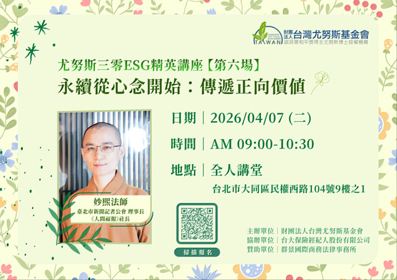 其中,4月7日場次將以《永續從心念開始:傳遞正向價值》為主題,並特別邀請台北市新聞記者公會理事長暨人間福報社長妙熙法師主講,分享「覺察」到「轉念」的歷程,引導與會者理解心念如何影響行動,並進一步探討永續理念如何在生活中落地實踐。