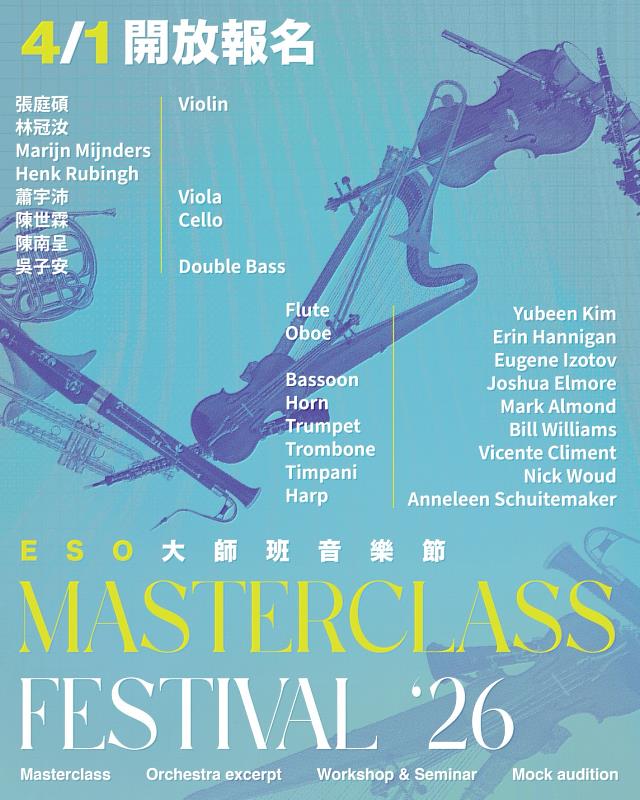ESO音樂學苑「2026大師班音樂節」採甄選制,將於4月1日開放報名,亦歡迎海內外音樂熱愛者報名旁聽課程。張榮發基金會秉持公益精神,將為有經濟需求的學員提供學費減免,期望降低負擔,讓學習更無後顧之憂。活動詳情請見ESO官網最新消息,把握與大師深度學習、接軌國際舞台的寶貴機會。