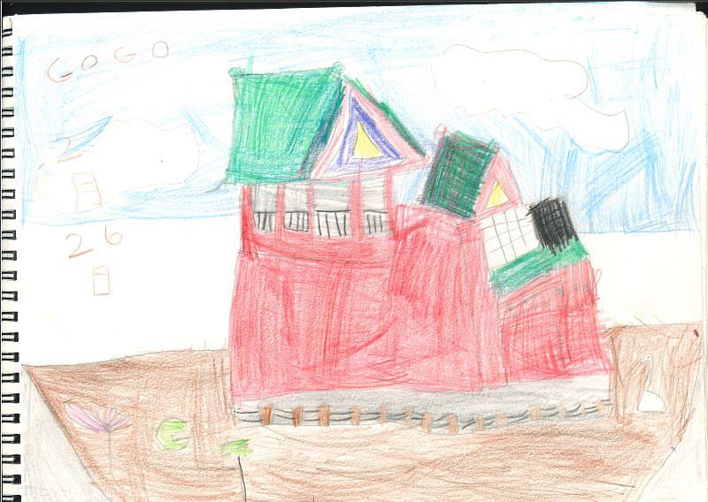 由於寫生活動場地剛好可遠眺國立歷史博物館背面景致,孩子們將眼前所見轉化為畫面,運用鮮明的紅色與綠色描繪建築結構,透過簡潔有力的線條與大面積色塊,呈現出對空間與形體的直觀理解,畫面充滿童趣,也真實反映當下的觀察經驗。