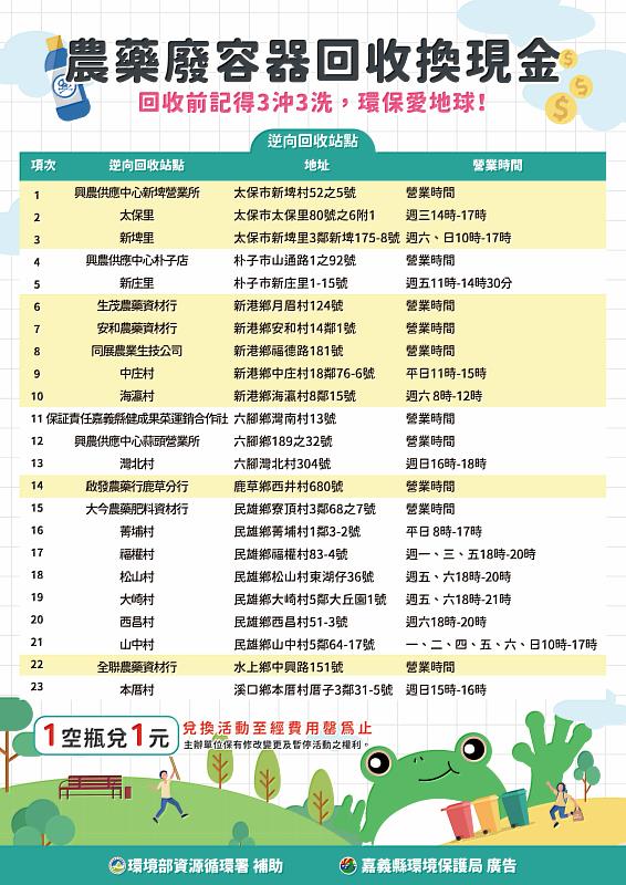 嘉義縣環保局今年成功媒合13家代噴業者設置逆向回收站點,並輔導10處農藥資材行提供農藥廢容器回收服務。全縣共計設有23處農藥廢容器逆向回收站,站點擴及太保市、朴子市、民雄鄉、溪口鄉、新港鄉、六腳鄉、鹿草鄉及水上鄉,提供便捷且多元的回收管道。民眾只需將沖洗乾淨的農藥廢瓶罐送至指定回收站,無論容器大小,均可享有「1瓶兌換1元」的優惠。活動經費有限,兌換至額滿為止,歡迎踴躍參與。