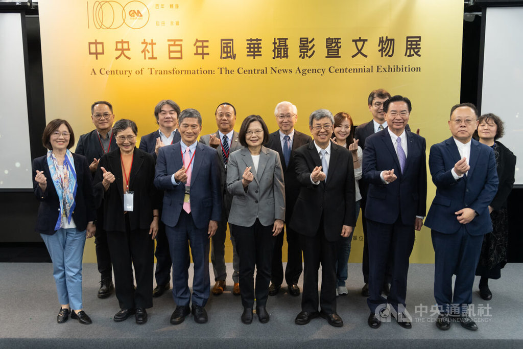 中央通訊社「百年轉身.自由永續-中央社百年風華攝影暨文物展」30日正式開展,總統蔡英文(前左4)、行政院長陳建仁(前右3)、外交部長吳釗燮(前右2)、文化部長史哲(前右)、總統府資政葉菊蘭(前左2)等開幕式與會來賓,一同和中央社董事長李永得(前左3)及社長曾嬿卿(前左)比出小愛心合影留念。中央社記者翁睿坤攝 113年3月30日