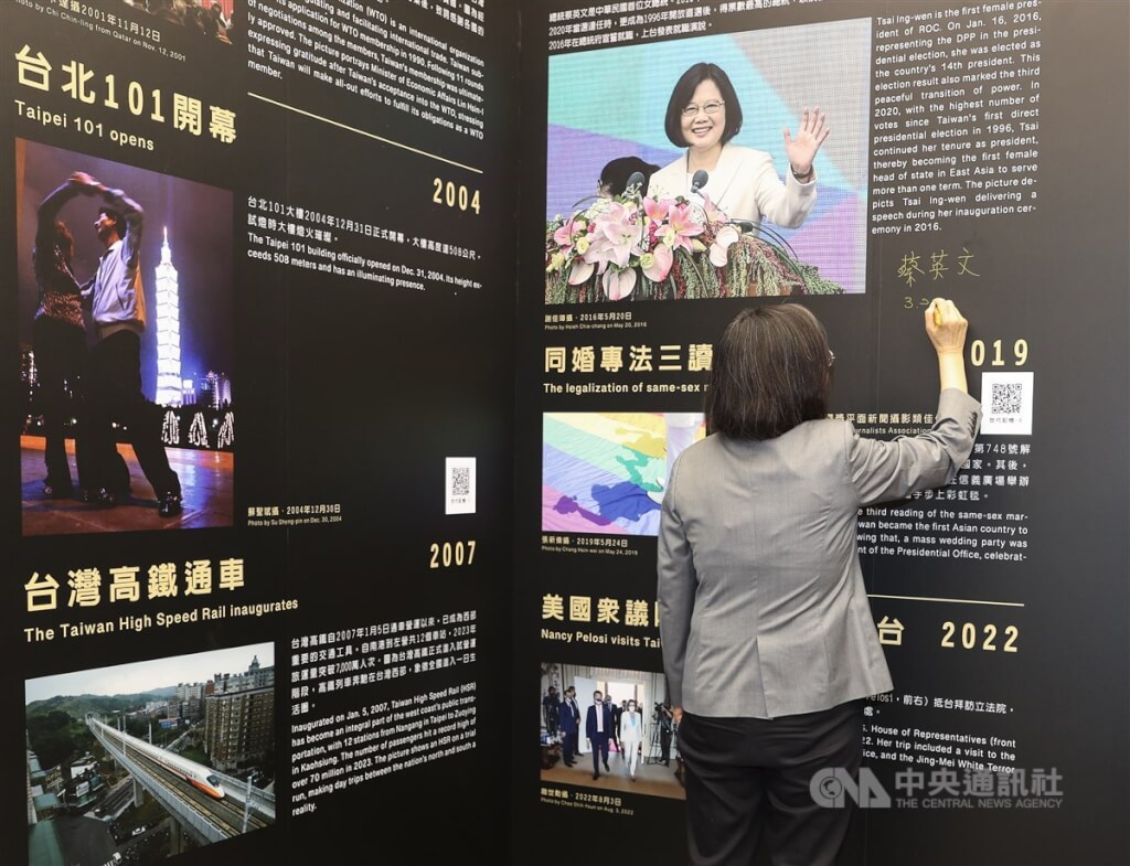 中央通訊社成立100週年系列慶祝活動「百年轉身.自由永續-中央社百年風華攝影暨文物展」30日正式開展,總統蔡英文(圖)應邀出席參觀展區,並簽名留念。中央社記者謝佳璋攝 113年3月30日