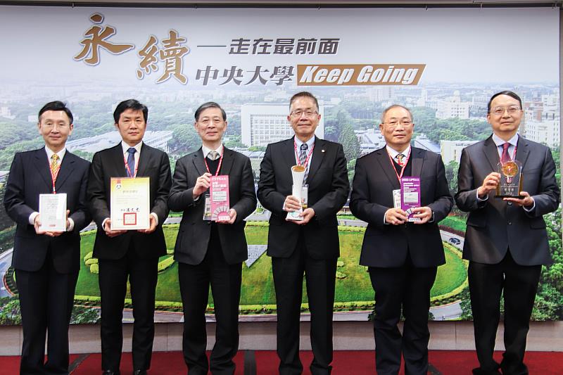中央大學在永續辦學有卓越的表現,獲各方榮耀之肯定。照片左起永續發展暨社會責任辦公室孫煒主任、許秉瑜副校長、綦振瀛副校長、周景揚校長、顏上堯副校長、周立德主秘。