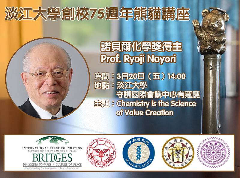 (中央社訊息服務20260316 15:05:36)淡江大學將於3月20日下午2時,在守謙國際會議中心有蓮廳舉辦「熊貓講座」,邀請2001年諾貝爾化學獎得主、日本名古屋大學特別教授野依良治(Ryoji Noyori)蒞臨淡水校園,以「Chemistry is the Science of Value Creation(化學是創造價值的科學)」為題發表專題演講。講座將以英文進行,並提供即時中文字幕。