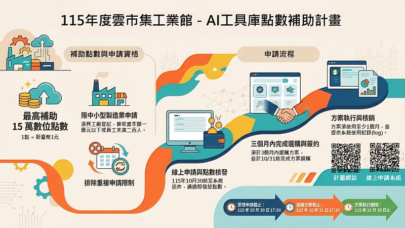 為響應國家「產業AI化」政策,鼓勵中小型製造業運用人工智慧技術解決生產及營運瓶頸,「115年度雲市集工業館-AI工具庫點數補助計畫」(以下簡稱本計畫)即日起受理申請,主要透過便捷的數位點數機制,提供中小型製造業採購AI應用方案之補助,旨在強化企業數位營運韌性並加速數位轉型腳步。