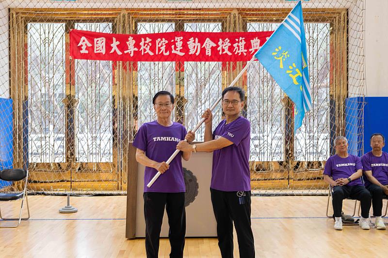 115年全大運授旗典禮,葛煥昭校長(左)授旗予陳逸政體育長。(圖/淡江大學提供)