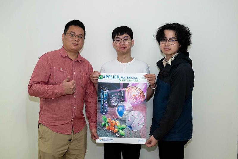 物理系王孝祖副教授(左起)帶領碩一生李奇峰、張億宏,對「富鋰錳基」正極材料的研究成果,獲國際知名期刊《ACS Applied Materials & Interfaces》刊登並選為封面。(圖/淡江大學提供)