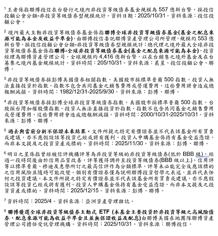 (中央社財經訊息服務20251216 14:30:11)台灣最大主動非投資等級債券基金公司(註1)聯博投信,推出全新主動式非投資等級債券ETF–00984D,聯博優選全球非投資等級債券主動式ETF(本基金主要投資於非投資等級之高風險債券,配息來源可能為收益平準金且並無保證收益及配息),並成為第一家在台發行非投資等級債券主動式ETF的外商資產管理公司。承襲兩檔台灣境內與境外最大非投資等級債券基金投資基因(註2),聯博00984D以已開發國家非投資等級公司債為核心,為投資人追求收益與成長機會。每股發行價格定為新台幣10元,並採每月配息機制,將於2026年1月12日至16日展開募集。