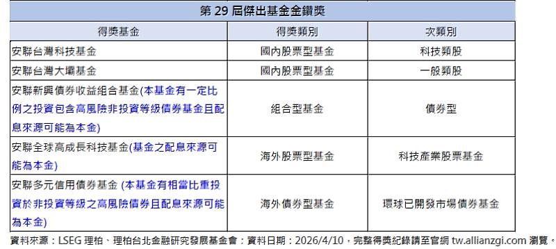 安聯投信橫掃2026年LSEG理柏台灣基金獎8項大獎、第29屆傑出金鑽獎5項殊榮