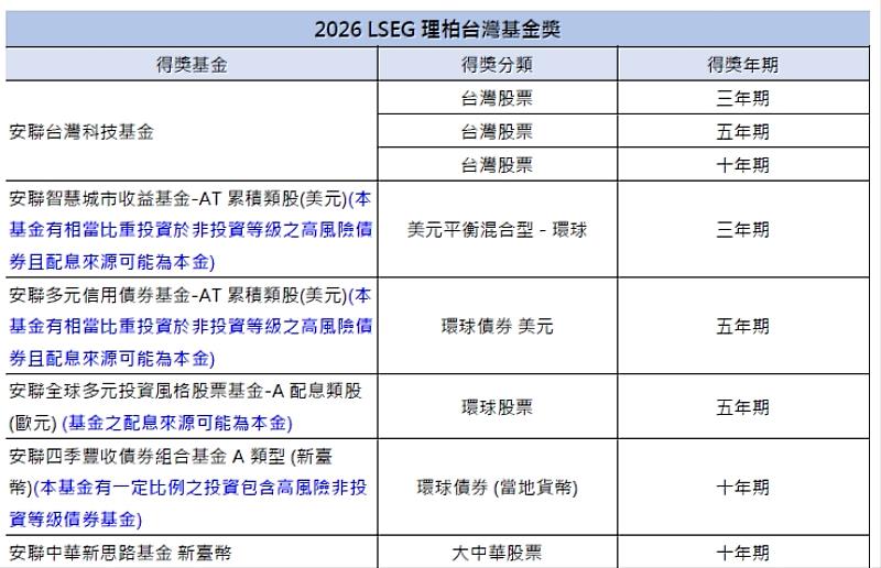 (中央社財經訊息服務20260410 16:54:08)2026年LSEG理柏台灣基金獎正式揭曉,安聯投信表現亮眼,一舉榮獲8項大獎肯定,涵蓋境內基金5項與境外基金3項殊榮,再次展現其深厚的投資研究實力與主動核心價值投資的長期成果。其中,安聯台灣科技基金同時拿下3年期、5年期及10年期3項大獎,締造「全壘打」佳績,突顯安聯投信台股投研團隊在產業趨勢掌握與選股能力上的整合實力。