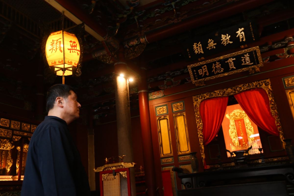 走進祭孔主殿,只見他恭敬鞠了躬,凝定了一會兒,一個轉身,他好奇望著門口那座民國50年鑄成的香爐,瞬間,他的神情像是當年那位不知地厚天高的小鬼,他湊上前,輕輕摸撫著,然後弓起手指、敲彈起爐身…,「這真的是純銅鑄的,只有那個年代才有,這聲音…嗯。」