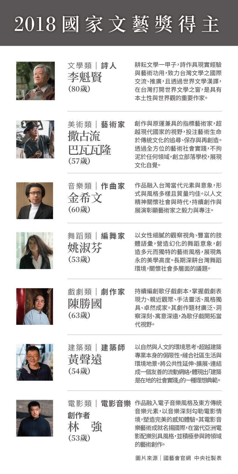 象徵國內藝文界最高榮譽的「國家文藝獎」,於2018年04月3日下午2時30分假淡水雲門劇場舉行贈獎典禮。獲得第20屆國家文藝獎的七位傑出藝術家為詩人李魁賢、藝術家撒古流.巴瓦瓦隆、音樂家金希文、編舞家姚淑芬、劇作家陳勝國、建築師黃聲遠和電影音樂創作者林強。