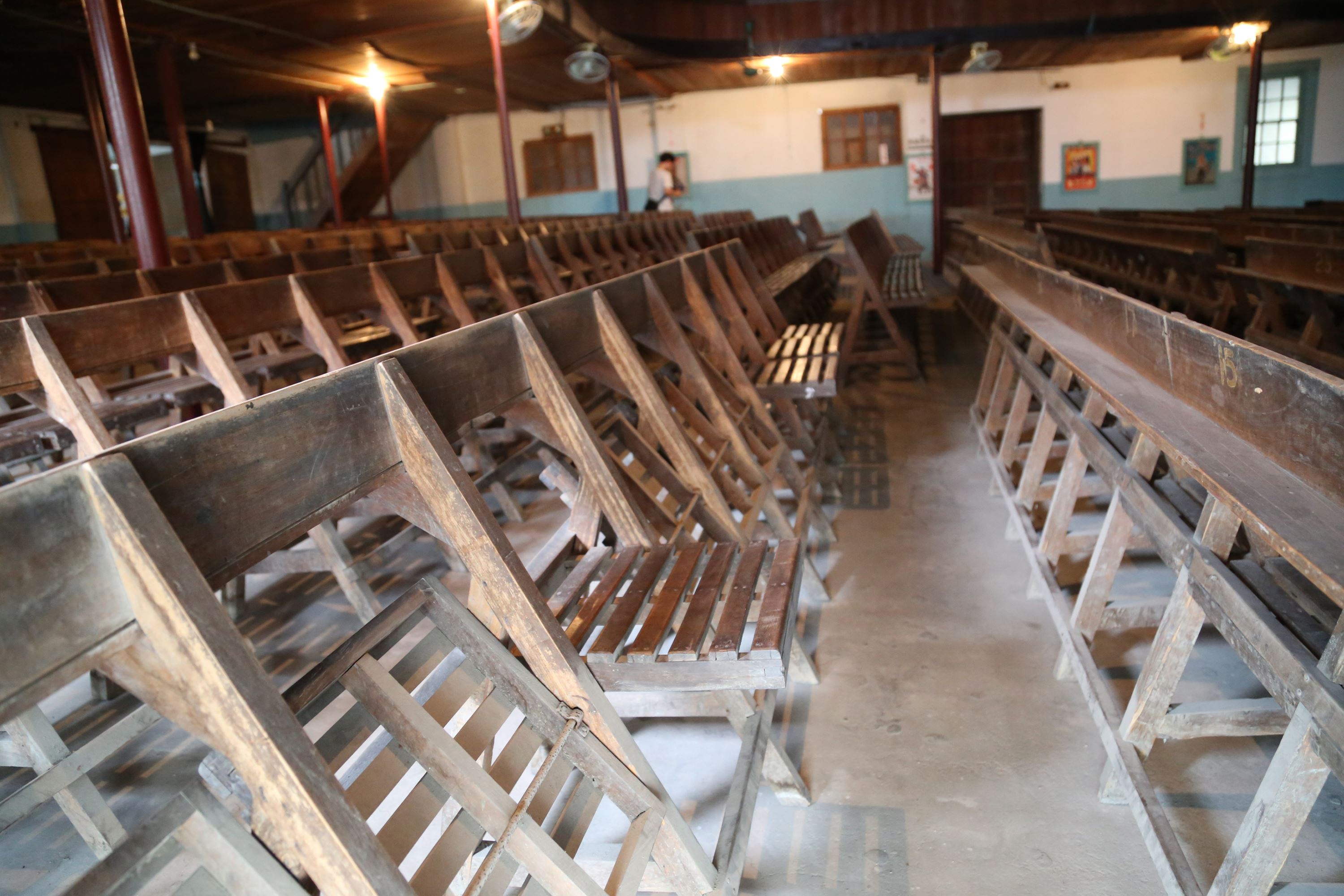 老戲院門口木門、木窗刻劃著歲月的痕跡,沿著樓梯走上二樓,一小間木造售票口映入眼簾,牆面上還掛著早年「空襲警報疏散圖」;進入戲院大廳,一幅對開黑色布帘仍維持著當年模樣。