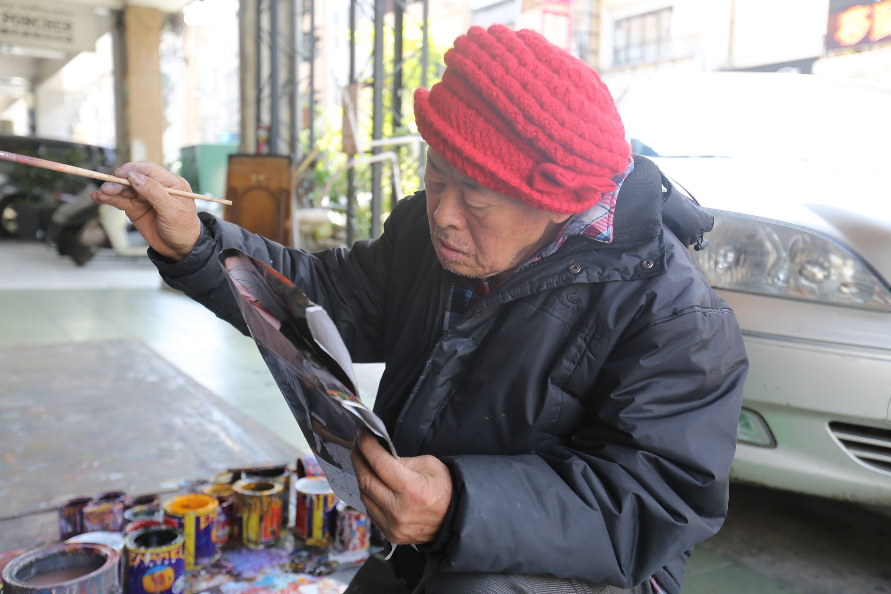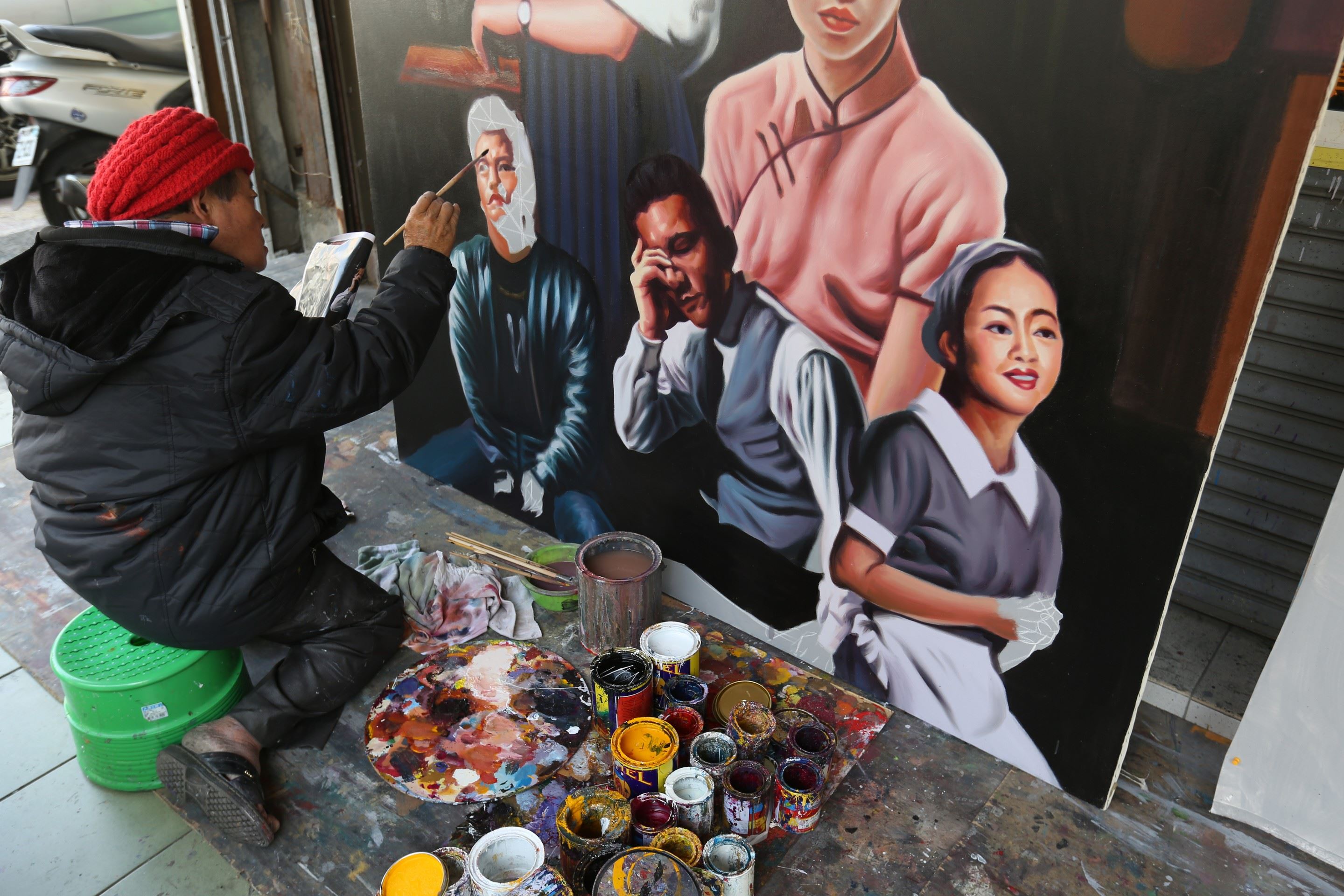 全美戲院的畫師歷年來也有不少人,如今是顏振發,想看他,很簡單,只要到全美戲院對面的騎樓,無時無刻都能看到他盯著海報在作畫,路人好奇駐足拍照,也影響不了他,身心靈似乎已完全投入眼前的畫布。