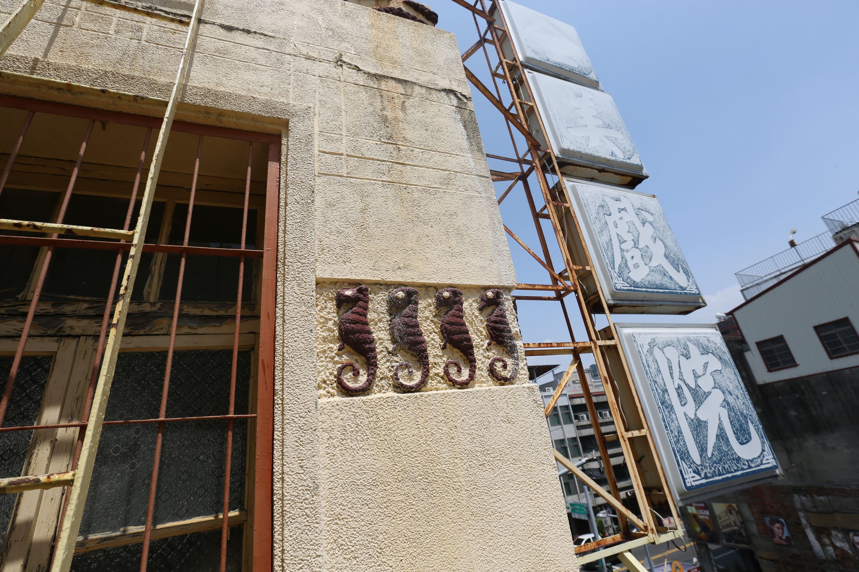 全美戲院這棟老建築,吳家也不知是何時興建的,只知這棟建築兩側構造對稱,樓梯窄又陡,上下樓不容易,三樓還有黑色蝙蝠及海馬的浮雕,蝙蝠代表「福氣」,海馬象徵「多子多孫」。