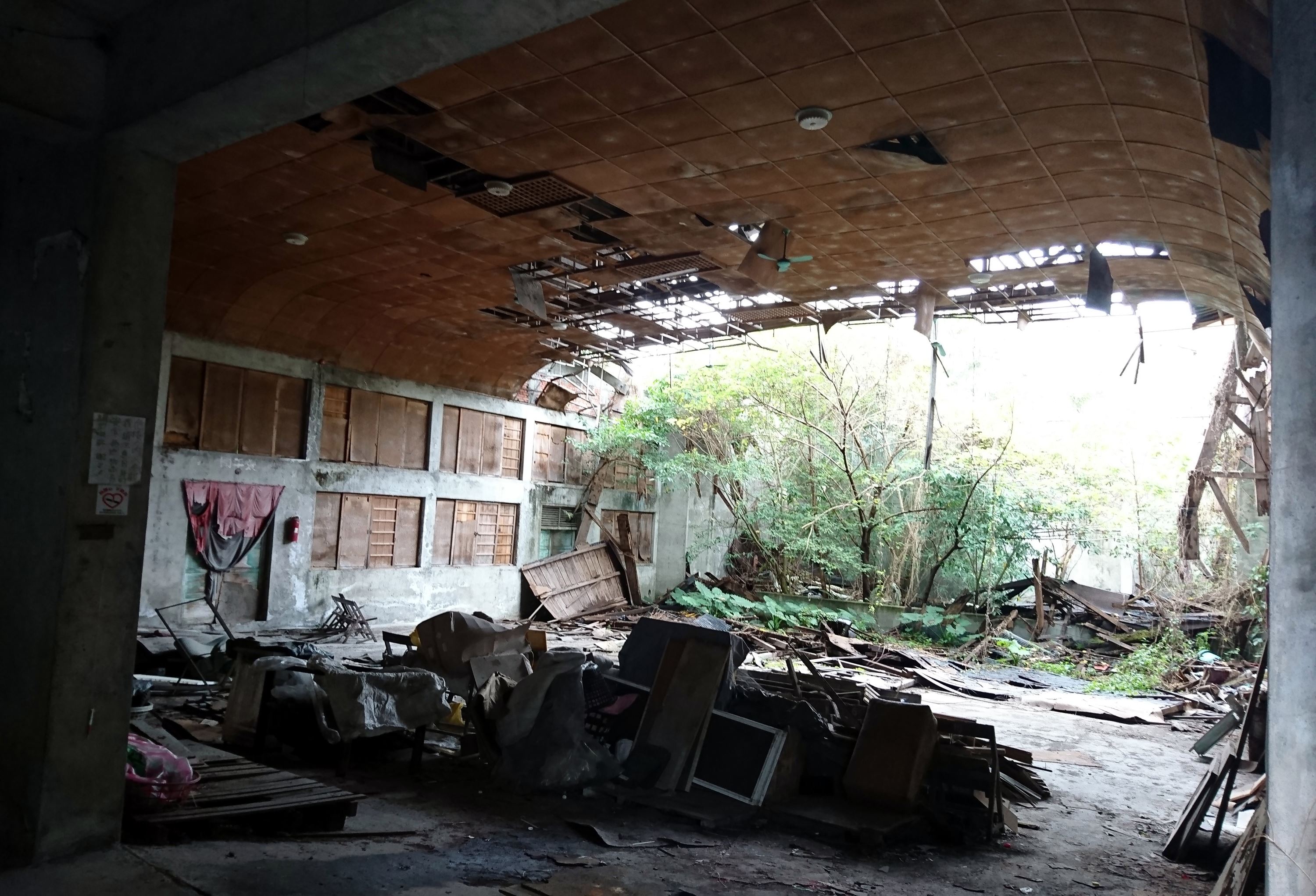 荒廢30年的建物牆壁已斑駁,但「金星大戲院」5個字依然醒目,前年尼伯特颱風的破紀錄17級強風,摧毀了一百多坪的電影大廳,可是水泥牆的播放室還硬頸挺立著。