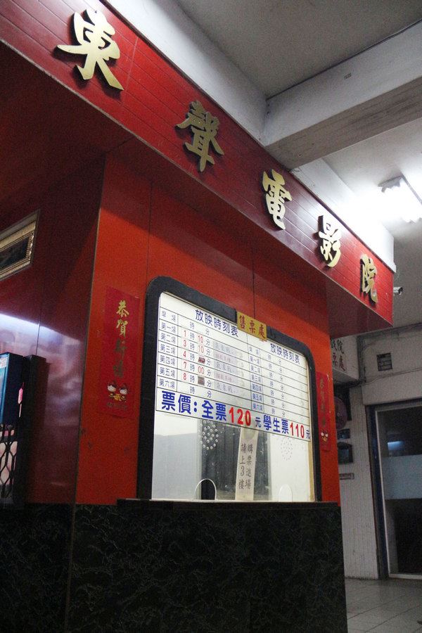 東聲電影院位在苗栗縣頭份市金天地商業大樓3樓,設置在一樓的售票處是早期迎賓據點,清楚記載每場次的放映時間、片名,以及「票價:全票120元 學生票110元」。因為生意大幅下滑,戲院不再請員工,售票、清潔、放映,所有大小事都由老夫婦一手包辦,售票窗口擺上牌子「請上3樓購票進場」。