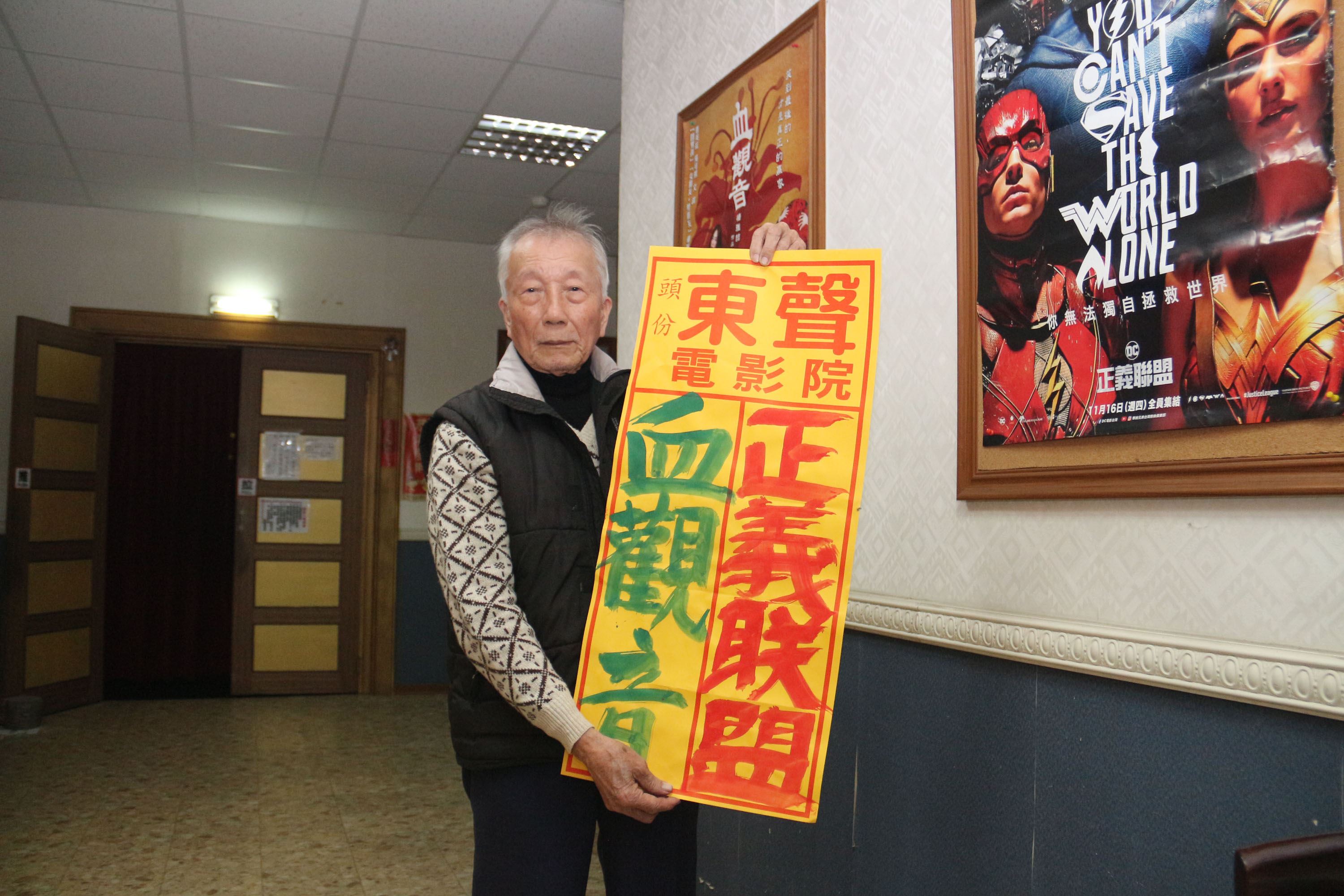此時,徐琳彬正忙著製作戲院最後一檔影片的宣傳廣告,黃色長條形壁報紙上,兩行分別以紅色、綠色顏料書寫的片名「正義聯盟」、「血觀音」,和牆上片商提供的印刷海報相比,絲毫不拐彎抹角,還多了分手寫溫度。