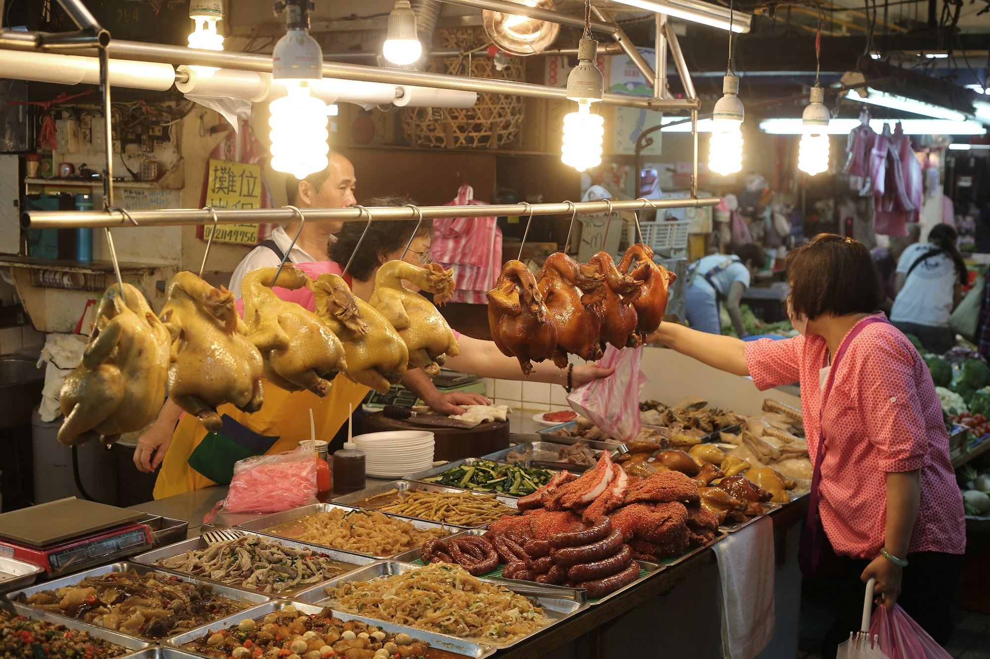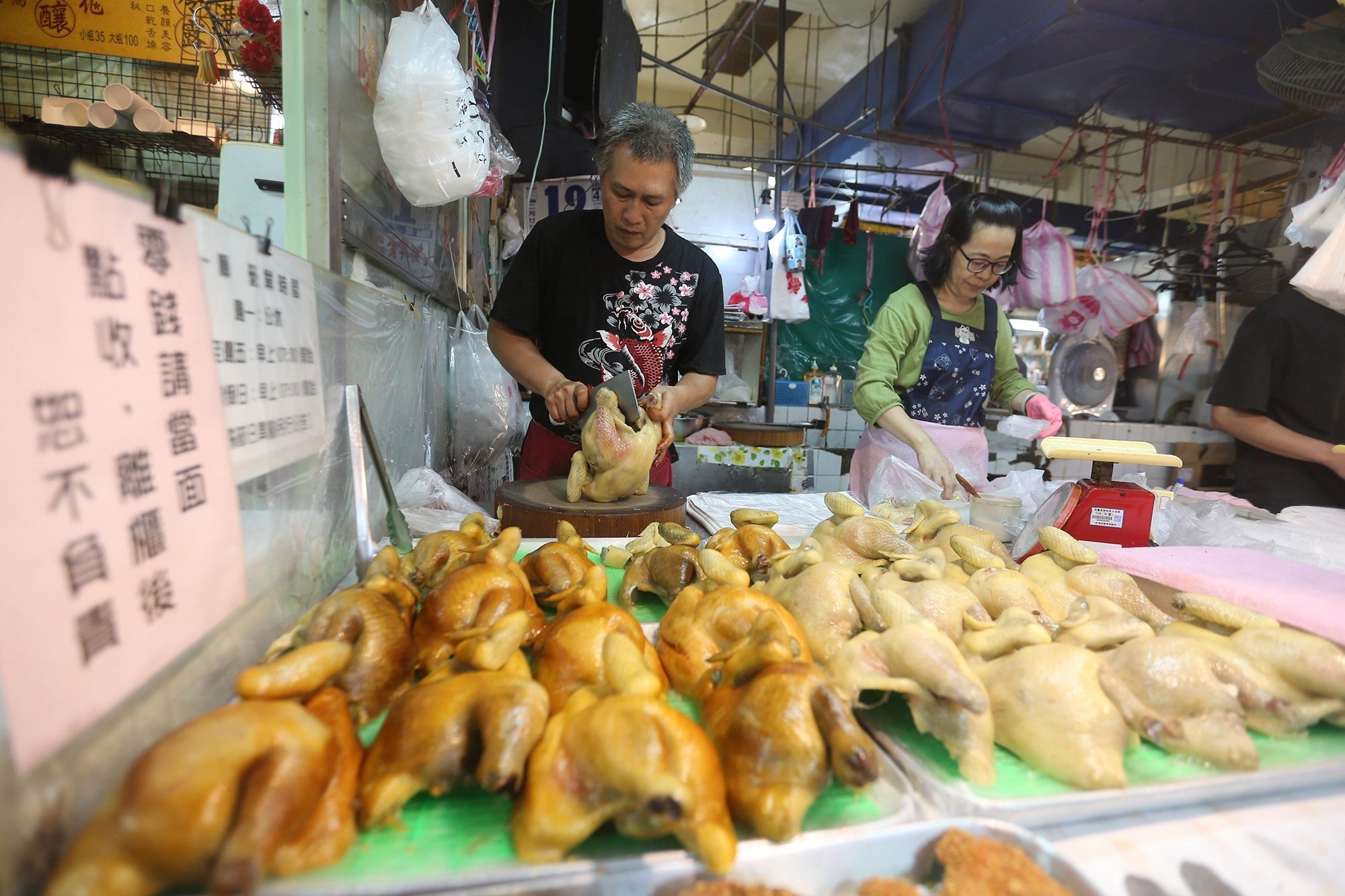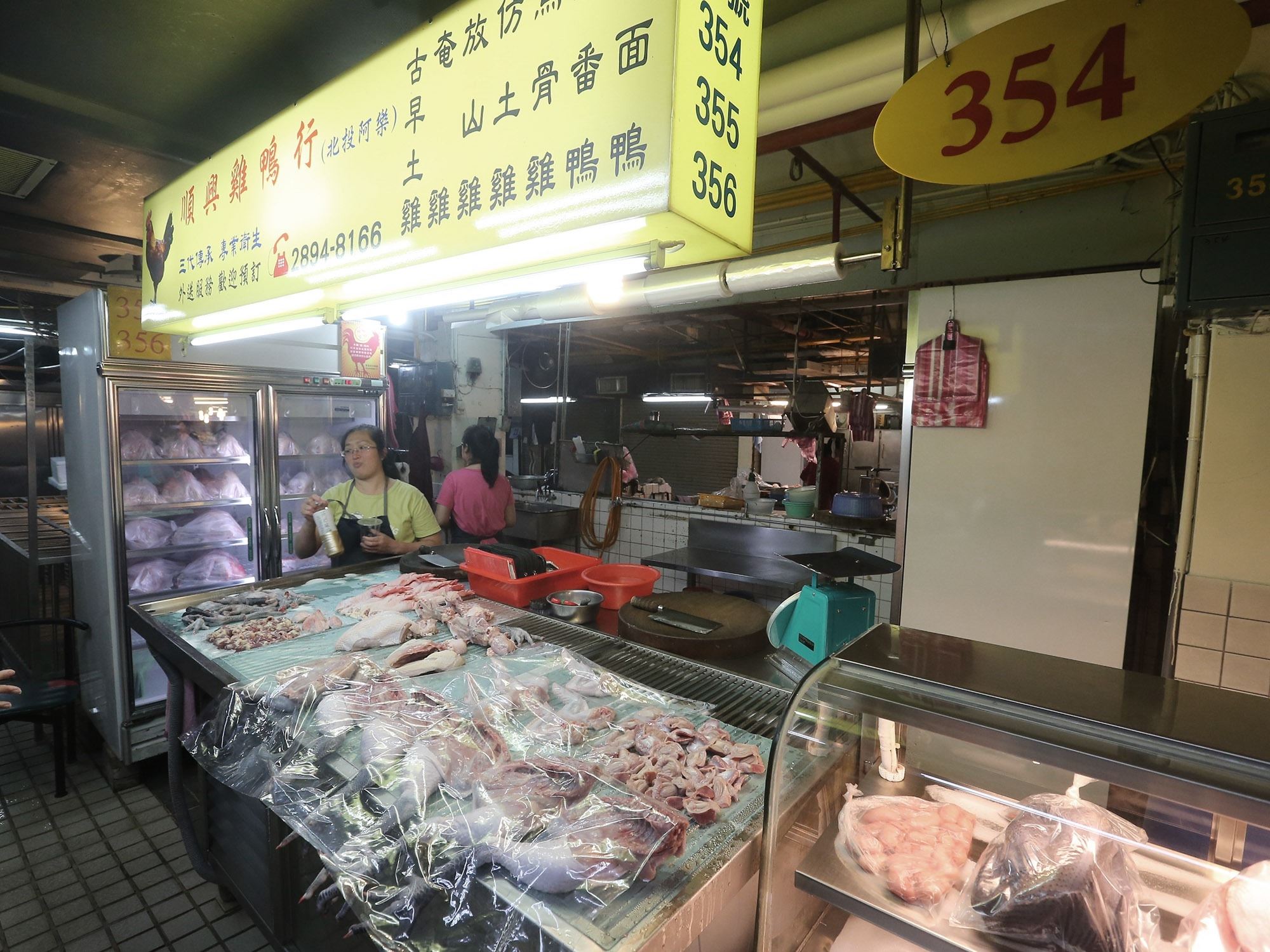 傳統市場裡也可看到在地飲食文化,像鹽水雞,聽徐仲解釋,原來這是台灣人的烹調方法,香港就沒有。熟食鋪上肥美的捆蹄,原來是北客家莊的特色菜,一般市場已不常見。
